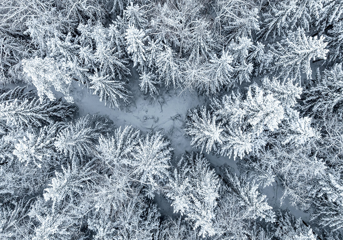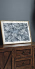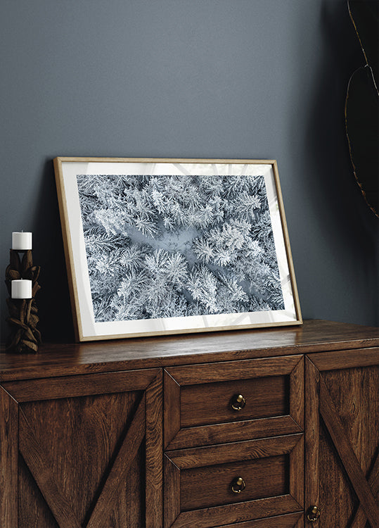 A quiet winter atmosphere unfolds in a subdued forest, where the snow lays a soft blanket over the dark silhouettes of the trees. Haze and faint shades of blue create calm and depth, while traces of light lead the eye into the landscape. A poetic, Nordic atmosphere – created by Margus Vilisoo. Perfect for wintry walls and tranquility in the room.