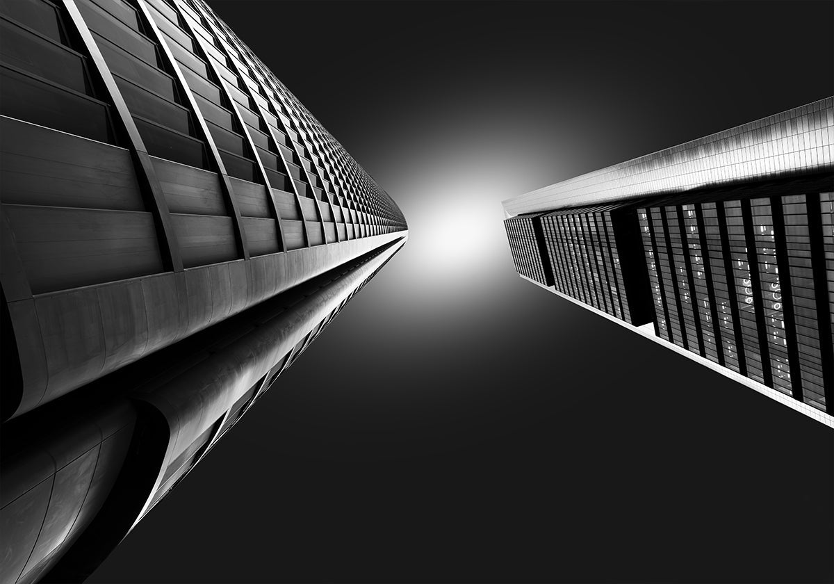 "Raise to the light" by Sergio Cameno captures Madrid's iconic CTBA skyscrapers in dramatic black and white. The floating lines and sharp angles lead the eye towards the light, where glass and steel dissolve into graphic forms. An elegant tribute to modern architecture and dynamic metropolitan energy. The clouds stretch like soft ribbons, while the perspective draws you in