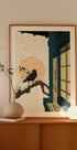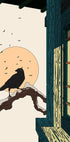 A clean, minimalist scene: A raven rests on a branch in front of a Japanese window, where the winter landscape is bathed in a soft sunrise. Geometric panes frame a calm sky with moon and pastel tones. Japanese-inspired aesthetics with a manga touch, created by Nicholas, bring stylish peace to the home. And a touch of winter magic.