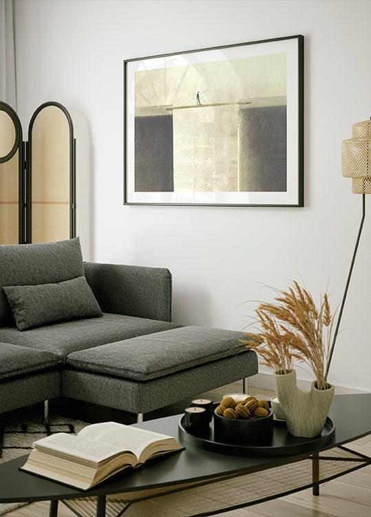 A modern conceptual work depicting a figure balancing on a narrow plank between two rocks. The artwork expresses courage, change, and the fragile path to personal development.