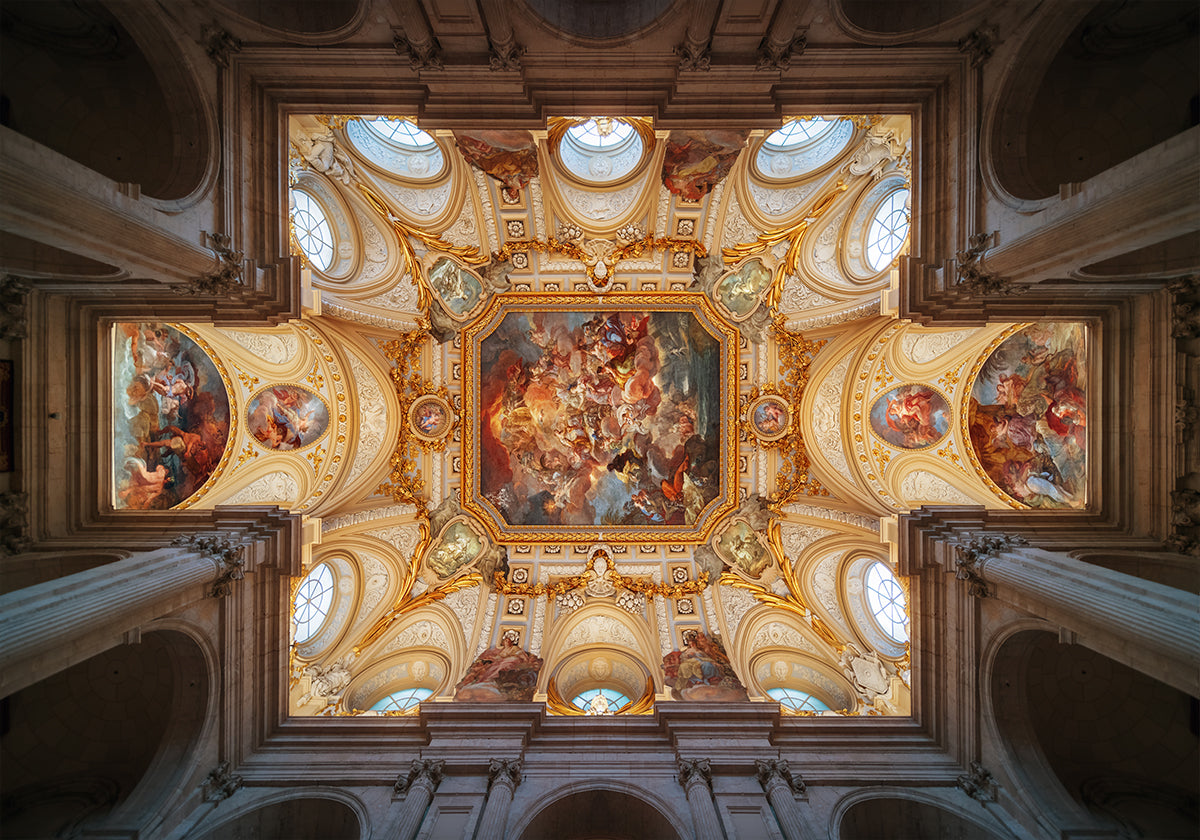 A majestic look up into a royal palace in Madrid: gilded details, baroque ornaments and strict geometric symmetry meet in a hypnotic composition. The dramatic shift in perspective leads the eye towards the center point and captures grandeur and history in one moment. Photograph by Juan Pablo de Miguel. Perfect for architecture lovers.
