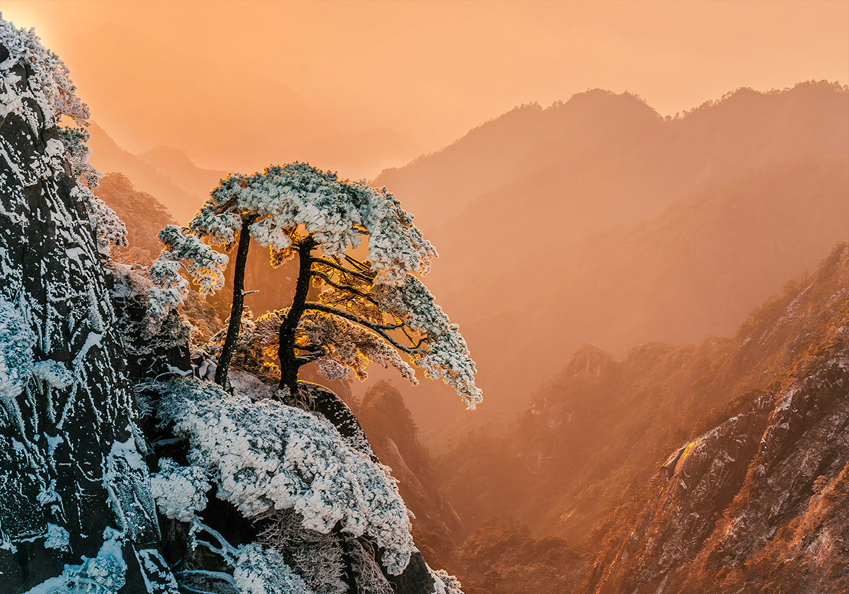 Resilience on the Edge by Wei (David) Dai captures a wintry mountain landscape in the first light of day: snow-covered firs cling to a steep cliff edge as the sun's quiet glow breaks the horizon. An image of strength and calm, where cold, height and hope meet in a poetic sunrise. Perfect for dreaming towards new peaks.