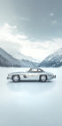 A retro silver car parked by a frozen lake, surrounded by snowy mountains and a high, clear winter sky. An elegant model adds a touch of ski-lodge glamor and luxurious nostalgia. The contrast between the calmness of the ice and the classic lines of the car creates an atmospheric, timeless scene. Perfect for lovers of retro and wintry landscapes.