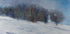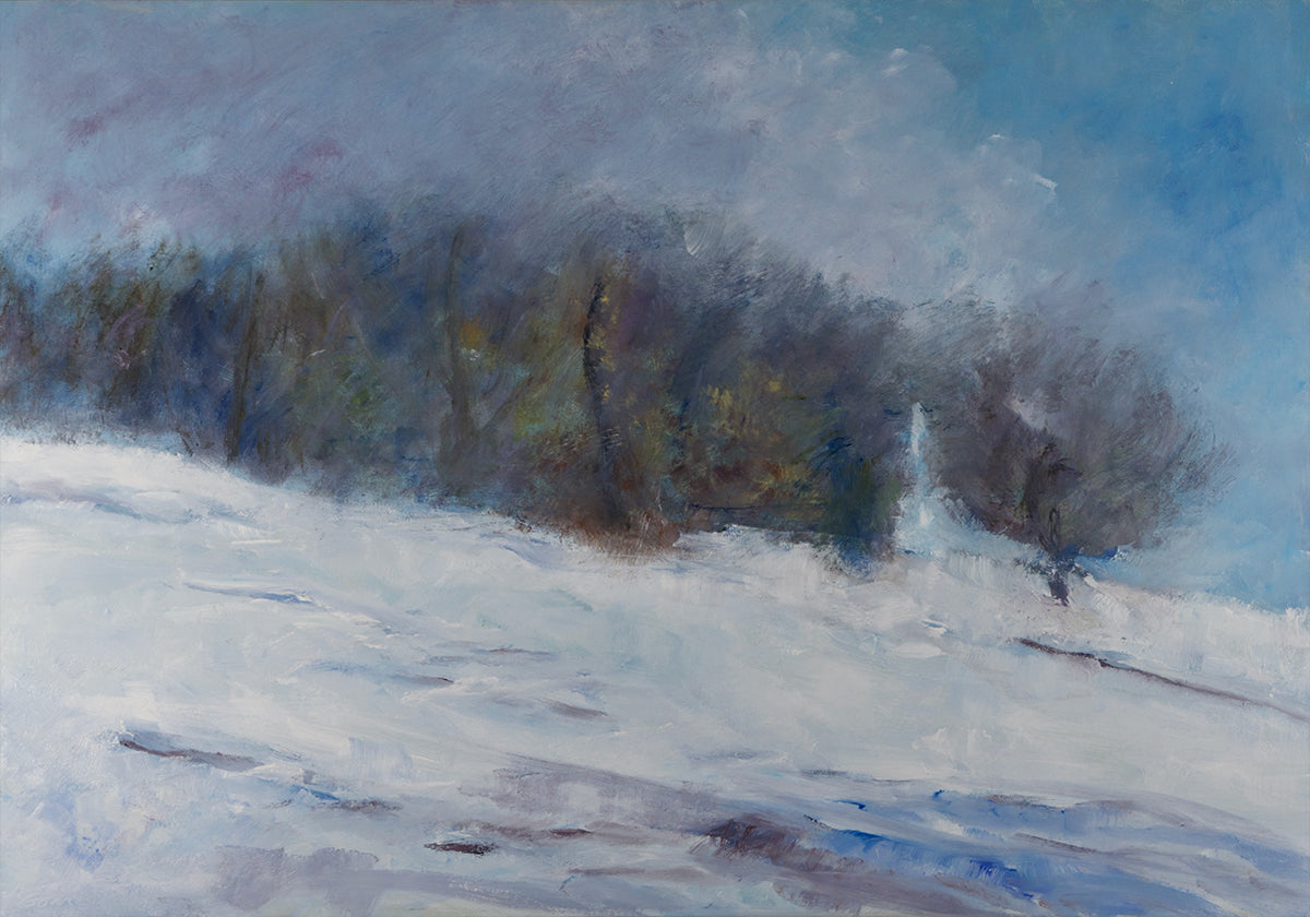 Ridge Line by Richard Gombar depicts an abstract winter ridge in blue tones: heavy clouds, drifting snow and dark forest edges that slide together into a mood of calm and tension. The wind blurs the contours, and discreet tracks suggest the route of the cross-country ski through the quiet, vast landscape. A modern, impressionistic winter motif for the home.