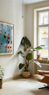 Janel Bragg's Rose Hips At Christmas captures the poetry of winter: glowing red rose hips on delicate branches, set against cool blue and green watercolor strokes. The abstract composition balances lightness and depth, creating an evocative, Christmassy botanical scene that adds warmth and color to any room. Perfect as a wintery focus in the living room or as a poetic gift.