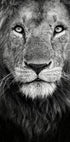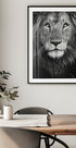 A stunning black and white lion portrait that highlights majestic features and an intense gaze. This wildlife photograph captures the king of the jungle in striking detail, showing the beauty of nature and the raw strength of the animal kingdom.