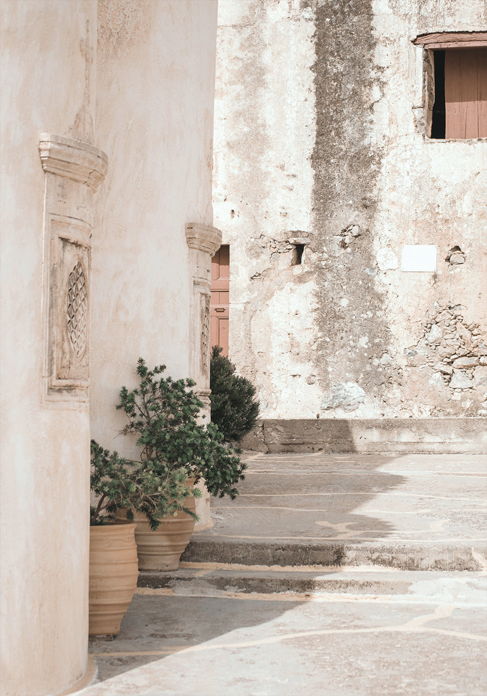 A serene motif of a rustic corner in a Mediterranean street with aged walls, potted plants and soft sunlight. This artwork captures the timeless charm of Mediterranean architecture and the beauty of simplicity, perfect for creating a relaxing atmosphere.