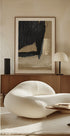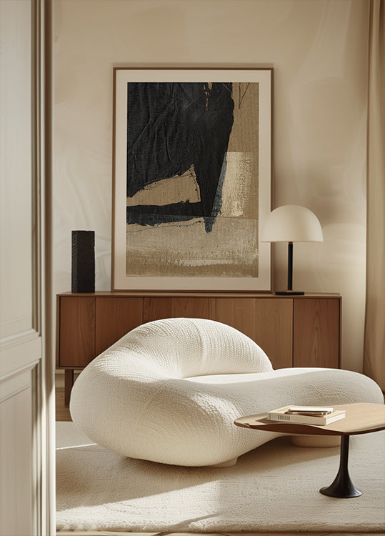 Say It by Dan Hobday is an abstract composition in warm beige and brown shades. Organic shapes meet distinctive brushstrokes and delicate layers that create calm depth and graphic tension. Minimalist surfaces, dark contrasts and soft movements invite the eye to explore the quiet rhythm of the work. In neutral, earthy tones.