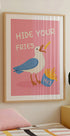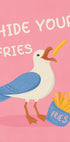 A wacky and humorous illustration of a seagull stealing fries, with the playful text “Hide Your Fries.” Bringing beach vibes and cheeky charm into the home, this colorful poster is perfect for the kitchen, children's room or interiors that embrace humor and light design.