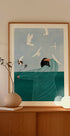 This artwork shows a pensive figure in striped clothing near the sea. Seagulls soar in the sky creating a peaceful coastal scene. The minimalist style emphasizes themes such as solitude and nature. Perfect for lovers of nautical art.