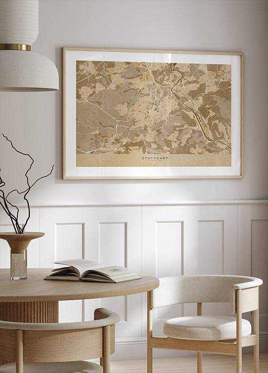 Discover the center of Stuttgart in an elegant, sepia-toned map, where the city's street network, squares and neighborhoods stand out in a beautiful vintage look. The warm tones and fine lines emphasize the historical atmosphere and provide a refined, nostalgic focal point for the living room, office or entrance hall. A stylish gift for architecture and map enthusiasts.