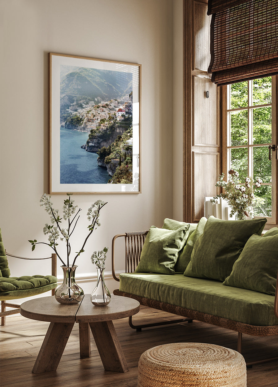 The poster shows a scenic coastline with a richly built village perched on a cliff, surrounded by green mountains and sea. The sunlight creates a bright and warm atmosphere, while the calm sea reflects the surrounding mountains. This image appears as an idyllic depiction of a picturesque Italian coastal area.