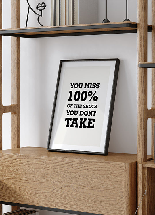 A powerful and inspiring typographic poster featuring the famous quote: "You miss 100% of the shots you don't take." Perfect for motivating athletes, entrepreneurs, and anyone striving for success. A great choice for offices, gyms, or personal spaces where motivation is important.