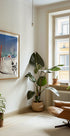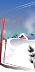 Ski landscape by Nicholas unites minimalist retro charm with fresh blue tones: snowy mountains rise against a clear sky, a small cabin glows warmly in the winter cold, and soft ski tracks wind down the piste. An atmospheric tribute to peace, adventure and the love of skiing. Perfect for the wall in the living room, cabin or office.