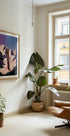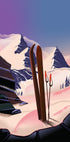 A retro-inspired ski poster in soft pastels: The sunset paints the sky, while snowy peaks rise above a broad alpine slope. A stylized skier with poles cuts a trail through the white, inviting European skiing atmosphere, adventure and winter calm. Illustration by Nicholas. Perfect for skiing all year round.