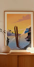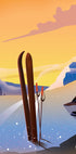 Ski Trip by Nicholas captures the calm before the evening run: snowy mountain silhouettes are reflected in a quiet lake, while ski tracks and upright poles suggest adventure. The sky's gradient from warm orange to deep purple casts a dreamy glow over the landscape and invites wintry escapism. Perfect for dreamers, wanderlust and alpine souls.