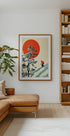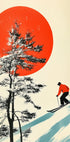 An elegant retro poster by Andreas Magnusson: A skier cuts a track down a snowy mountainside, flanked by dark trees, while a big red sun rises in the sky. The clean composition and vintage colors combine Japanese minimalism with classic skiing spirit - perfect for Nordic tranquility and a sense of adventure. Now.