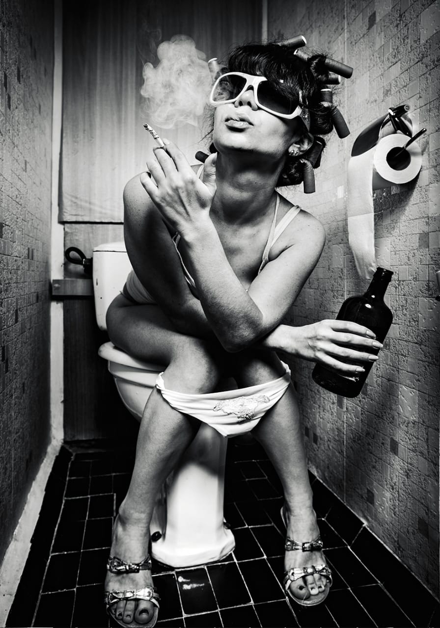 A striking black and white photograph that mixes humor and courage. The image shows a woman in a restroom with vintage curlers, oversized sunglasses, and a confident attitude. She holds a cigarette and a bottle, symbolizing defiant self-expression. This playful and unconventional artwork is perfect for eclectic home decor or for those who appreciate quirky, rebellious images.