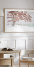 Snow at the lake by Ulrike Eisenmann captures the quiet poetry of winter: a frozen water mirrors the silhouettes of the forest, while snowflakes fall and bare branches draw fine patterns against the pale sky. A touch of red leaves breaks the cool play of colors and gives the subject warmth and depth. Perfect for creating calm and a winter atmosphere in your home.