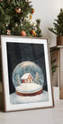 Step into winter magic: A classic snow globe with small town, pine trees and a cozy house bathed in warm light, captured in deep green and dark shades. Snowflakes dance in the quiet night and evoke retro Christmas atmosphere and nostalgia. Under the glass, the snow swirls around fir trees and roofs. An evocative motif by Melloi Art Prints.