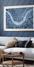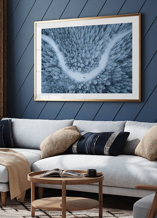 A breathtaking aerial view of a snowy country road winding through dense, dark pine forests. Small cars dot the route and give scale, while the quiet calm of winter descends over the landscape. The sharp contrasts between white snow and deep green shades create a graphic, minimalist expression of Gerald Macua.