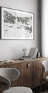 Snowy Mountain Peaks by Del Mundo Imagery captures the raw poetry of winter: jagged, snow-capped peaks rise above a quiet valley where dark pine forests disappear in mist. The monochrome light cuts sharp contours between snow and shadow, creating a calm, dramatic atmosphere of distant wilderness. The horizon appears in haze, and the silence is palpable.