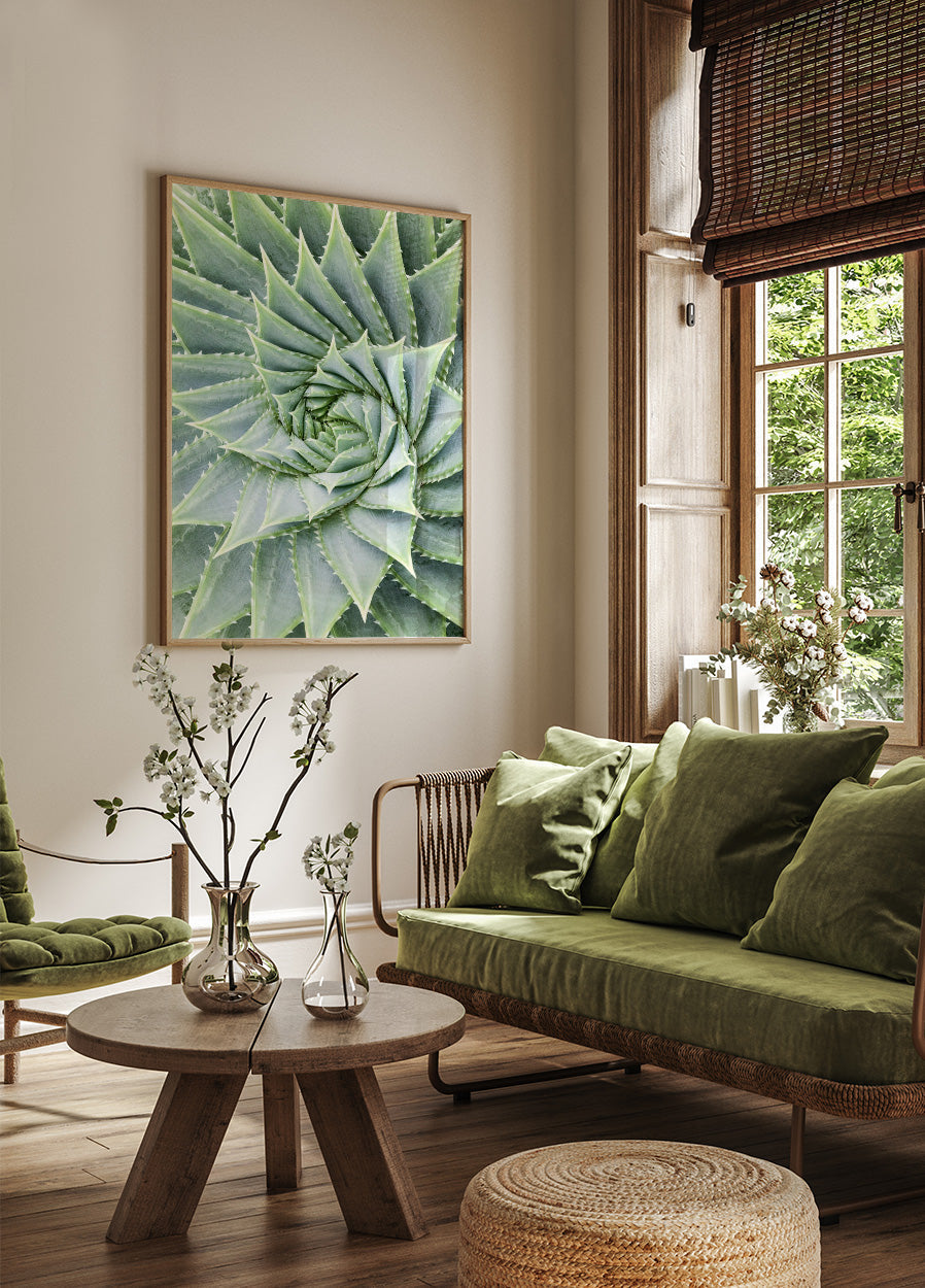 The poster shows a close-up of an aloe vera plant with a spiral structure of green leaves. The pointed leaves radiate from the center, creating a visual pattern that highlights the plant's natural symmetry and texture. The colors are soft and muted, giving a calm and organic expression.