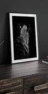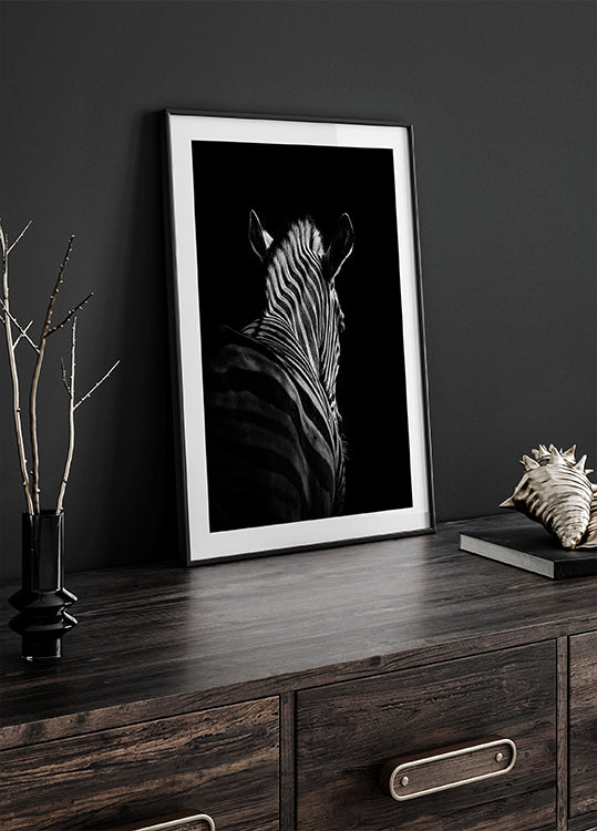 A zebra steps down from the darkness, and the graphics of the stripes cut elegantly through the deep black, while a sheen of dust suggests movement and stillness at once. Christian Meermann's black-and-white photography balances drama and minimalism – a quiet moment that becomes a strong, timeless eye-catcher in the room. Perfect for modern, Nordic decor.