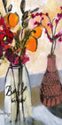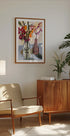 A vibrant still life by Janel Bragg: a simple mason jar filled with lush flowers in pink and orange tones that pop against a light background. The fresh brush strokes and bold colors create a warm, happy atmosphere and give your space a modern, botanical expression with poetic everyday charm. Perfect as a colorful focal point in the living room, kitchen or entrance hall.
