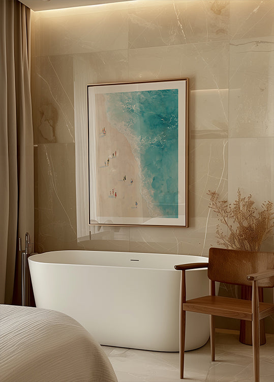 A serene and stylish overhead shot of people walking along the shoreline where the turquoise sea meets the light sand. Ideal for summer homes, coastal inspired spaces and modern wall art.