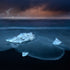Ice crystals glow on the black sands of Iceland, while soft, misty waves sweep by in a calm long exposure. The horizon dissolves in winter light, creating a meditative atmosphere of silence and drama. A minimalist, Nordic seascape photographed by Shenshen Dou at Diamond Beach. A picture of Icelandic winter magic, created for tranquility and contemplation.