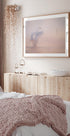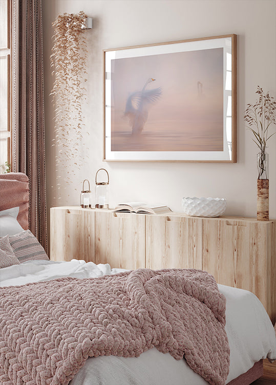 A dreamy scene in pink morning sun: a swan glides silently through the mist above the sea, while soft waves and reflections blur the boundary between water and sky. Alexandr Kukrinov's motif captures the fragile poetry of the moment – quiet longing, calm and movement at the same time. Perfect for rooms that call for reflection.