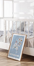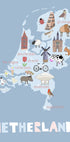 A playful, colorful Holland poster by artist Carla Daly: an illustrated map of Amsterdam, Rotterdam and Eindhoven, canals and windmills, tulips and bicycles. Animals such as cows, sheep and birds bring the land to life, while iconic places such as Evoluon adorn the motif. Perfect for the children's room or travel dreams.