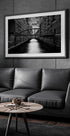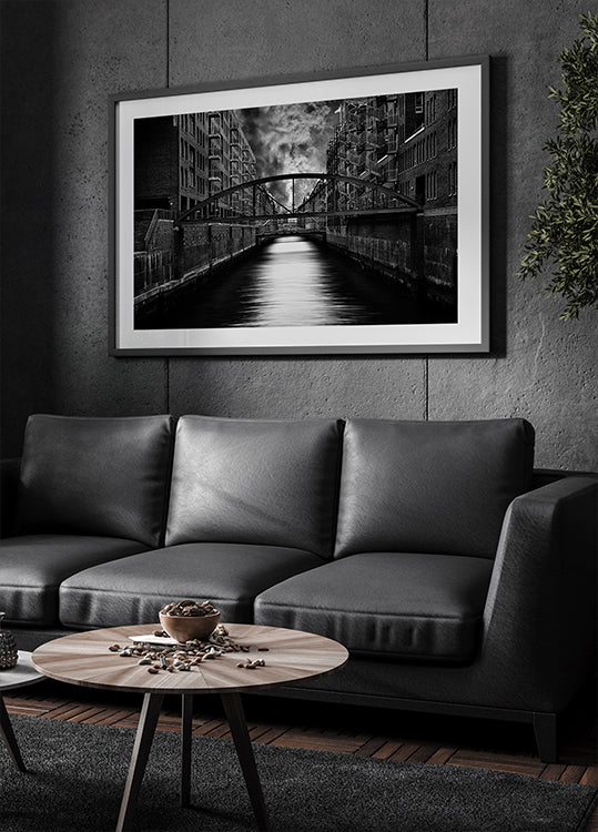 A dramatic, monochrome journey through Hamburg's canal district: brick facades and a low bridge draw the eye towards the horizon, while still water reflects light and shadow. Stefan Eisele captures the cool calm of the city with tight lines, symmetry and depth – an urban motif that invites contemplation. The motif pays tribute to the timeless geometry of Speicherstadt.