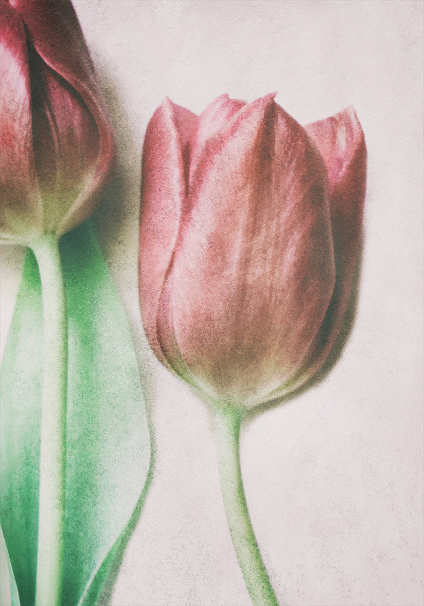 To lyserøde tulipaner bøjer sig mod hinanden i et stille kys, indhyllet i blødt forårslys og pasteller. Fine skygger og makrodetaljer giver motivet poetisk ro og nærhed. Delphine Devos indfanger øjeblikket med minimalistisk elegance – en romantisk hyldest til håb, ømhed og ny begyndelse. Et stille blikfang til soveværelse og stue.