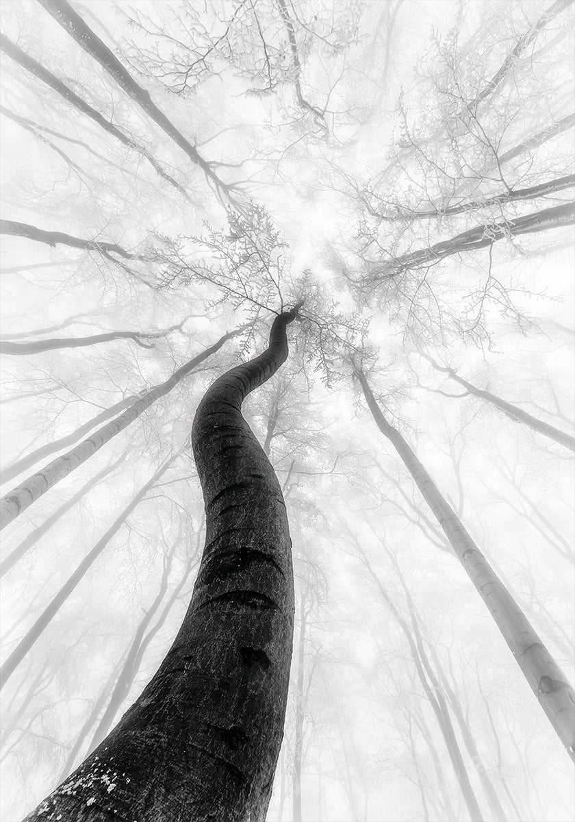 A quiet winter moment captured by photographer Tom Pavlasek: slender beech trees stand in the snow, shrouded in fog and frost. The soft gray and white tones create depth and calm, while the repeated strains draw graphic lines in the landscape. A minimalist, Nordic atmosphere for the home. Perfect for rooms seeking clarity, silence and nature.