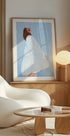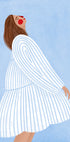 This artwork shows a calm female figure in a white striped dress against a soft blue background. The minimalist style emphasizes the elegant lines and soothing color palette, focusing on the themes of calm and grace.