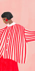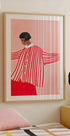 Stylized illustration of a figure in a bold red and white striped outfit against a soft pink background, capturing the essence of modern fashion art. The minimalist design and vibrant colors add dynamic elegance to this contemporary work of art.