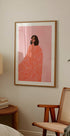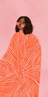 A woman wrapped in a flowing, vibrant orange patterned cloak against a soft pink background. This contemporary illustration captures warmth and style with a minimalist and abstract expression, perfect for contemporary art lovers looking for inspiration.