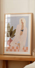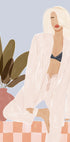 Minimalist Chic Woman Poster captures effortless style and quiet confidence. It shows an elegant blonde woman in an oversized light suit, with a hint of black underwear underneath. The work combines fashion-conscious sophistication with a relaxed, intimate atmosphere. The soft pastel colors in the clothes stand out beautifully against the muted blue-grey background, while a terracotta vase and earthy plants add warmth and balance to the composition. Perfect for fashion lovers, modern interiors or as a subtle statement in a stylish home or shop.