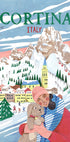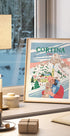 An evocative travel poster celebrating Cortina d'Ampezzo: snow-capped Alpine peaks tower over the lively village and a smiling woman in an elegant winter look, captured in a timeless, graphic expression. Caroline Bonne Müller combines retro travel atmosphere with modern charm – perfect for winter dreams with soft pastels and clear contrasts.