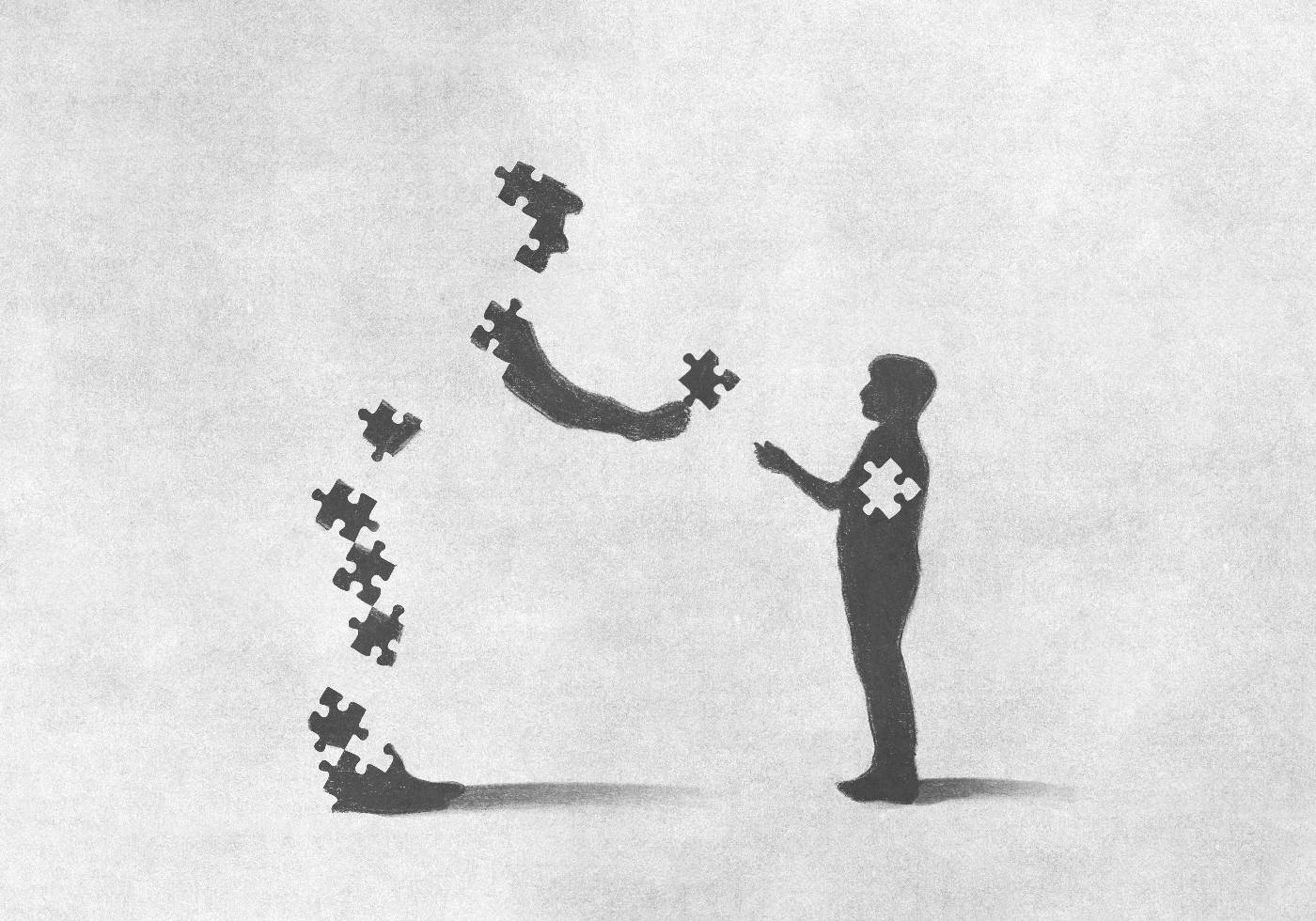 An emotional poster in shades of gray, where a figure gives his last puzzle piece to a child – a symbolic act of love, care and invisible sacrifice.