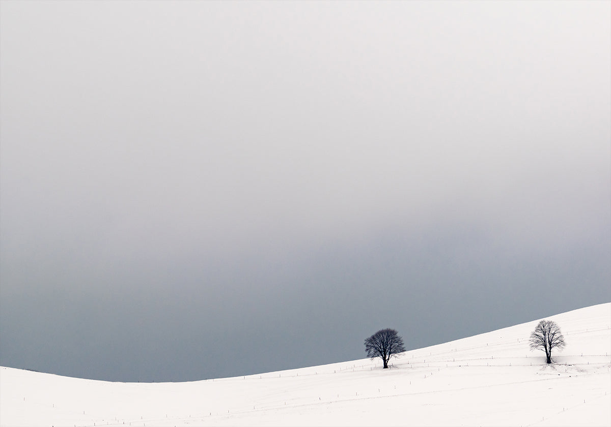 Two Alone by Hugh Warren captures the stillness of a snowy valley: soft slopes, a fence, and two lonely silhouettes in the distance, held together in the white. Dark trees frame the scene and suggest the depth of the forest, while the subdued light gives the subject a poetic calm and a sense of timeless winter. A motif that speaks of calmness and presence.