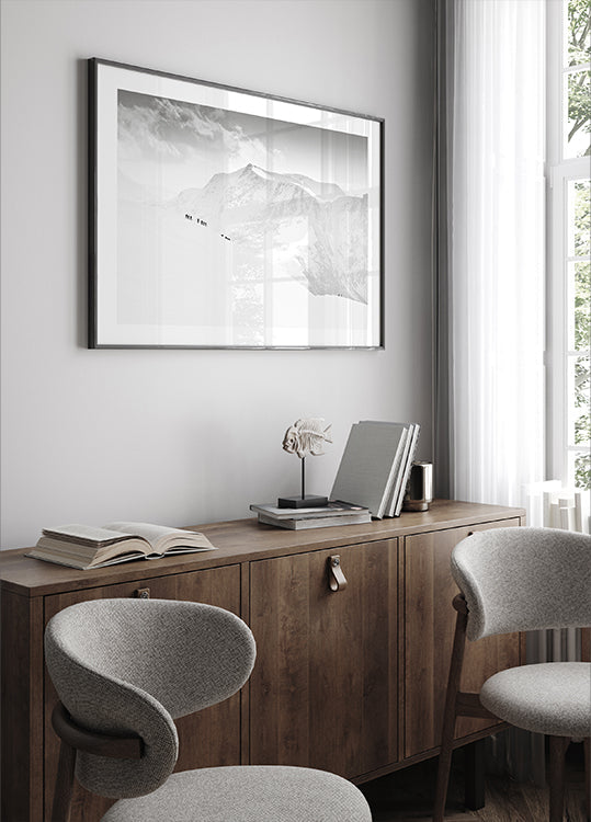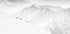 A bright, minimalist scene from the Sunnmør Alps in Norway: a series of small silhouettes of hikers and skiers moving in line along a snowy ridge towards a distant peak. The fine lines and the high light create a graphic, almost weightless expression. Photograph by Åsmund Keilen. The contrast between the white snowy landscape and the dark figures gives depth and calm.