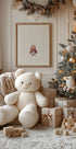 A heartwarming winter illustration by Xuan Thai: A little girl in a warm hat and knitted scarf is playing in the snow with her fluffy rabbit friend. Pastel colors and hand-drawn details create a calm, loving atmosphere, perfect for the children's room. Sweet and full of winter magic. Perfect as a gift for baby showers and kindergartens, creates coziness in the room all year round.