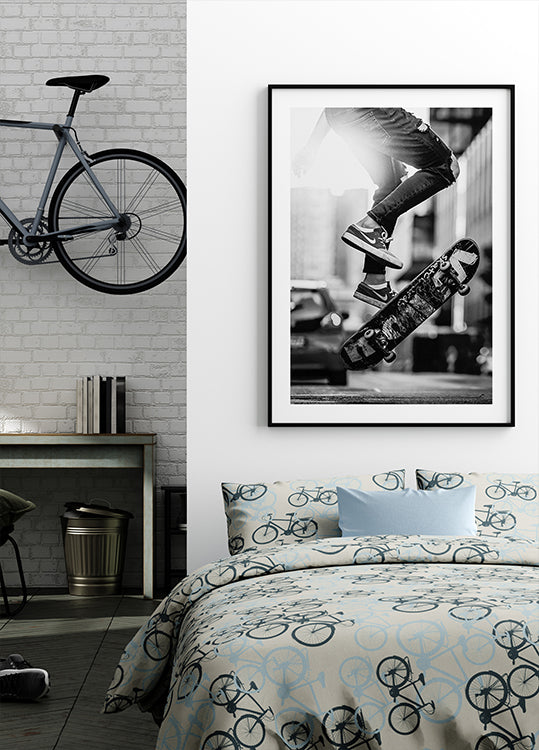 A powerful black and white image that captures the moment a skateboarder performs a trick in an urban environment. The worn sneakers, the torn jeans and the details on the skateboard create a raw and authentic atmosphere that reflects the energy and culture of street skating. The blurred background of the city streets highlights the movement and skill of the skater.