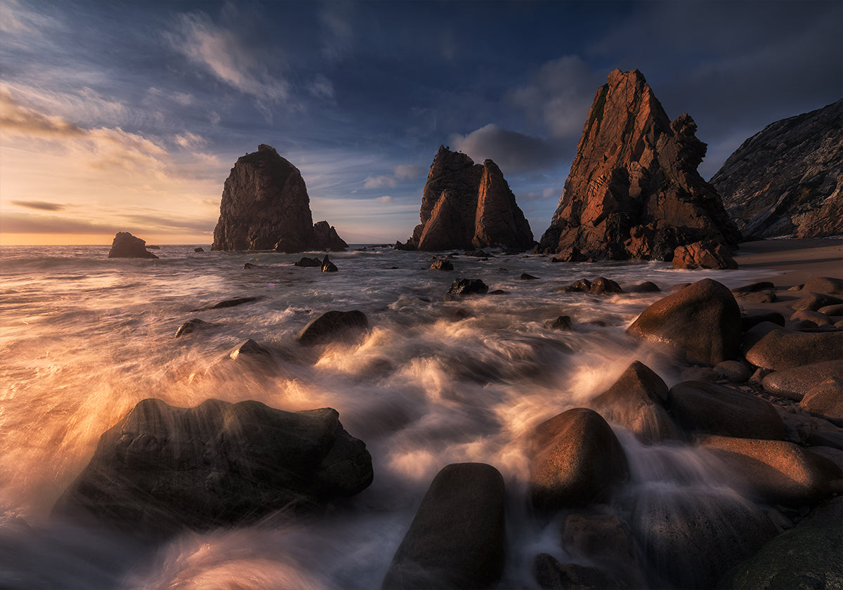 Ursa Beach by Carlos F. Turienzo captures the raw poetry of the Atlantic at Sintra: dramatic cliffs rise from the sea, while golden twilight caresses foamy waves. An atmospheric seascape, where the shower, the light and the tide meet in a timeless moment on Portugal's wildest coast. Perfect for dreaming away to the horizon.