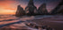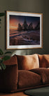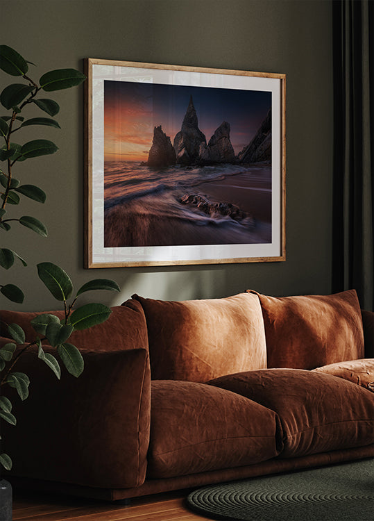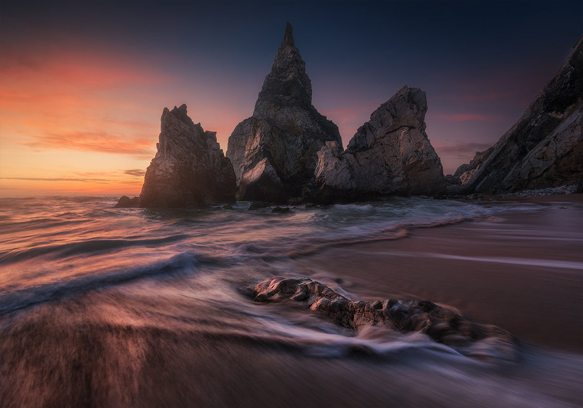 Praia da Ursa's jagged sea stacks pierce the Atlantic as twilight softens the sky above Sintra's wild coast. A long exposure turns the surf to silk, while warm sunset tones fade to deep blues, balancing drama and calm. This evocative seascape photograph is by artist Carlos F. Turienzo. Captured on Portugal's rugged Atlantic coast near Lisbon.