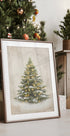 A cozy, vintage-style evergreen tree stands lightly sprinkled with snow, while warm golden lights twinkle between the branches. The subdued, paper-textured background and gentle snowfall create a calm and nostalgic Christmas atmosphere—ideal for a classic seasonal gallery wall or a simple winter corner.