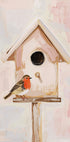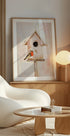 A quiet winter atmosphere in pastels: A cozy birdhouse stands in the snow, while a curious robin rests on the edge. The soft, acrylic-like brushstrokes and simple shapes give a poetic, Nordic expression. Discreet snowflakes and muted colors create peace and coziness. Art by Ohkimiko. Perfect for a wintry atmosphere in the home.